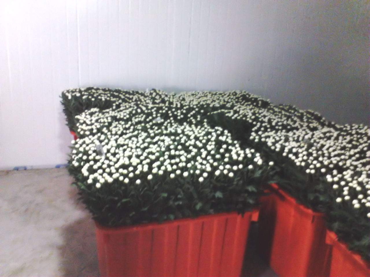 ■収穫された白菊です。これから選別や水揚げが行われますが、それらの作業に費やす時間や日本までの輸送時間など、総合的に判断をして一番良いタイミングで収穫れます。国産の菊より蕾はすこし堅めです。