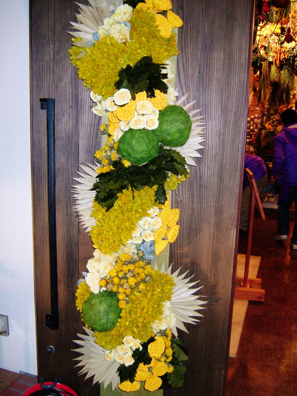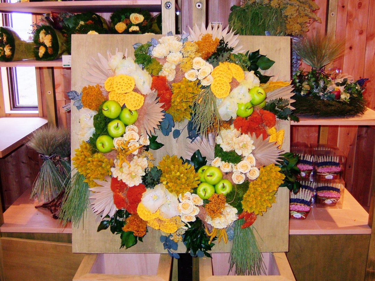 これは完成したリースです。お客さんは遠くから見ることになるので基本はグルーピングです。素材が何かわかるようにある程度のボリュームでグルーピングをします。