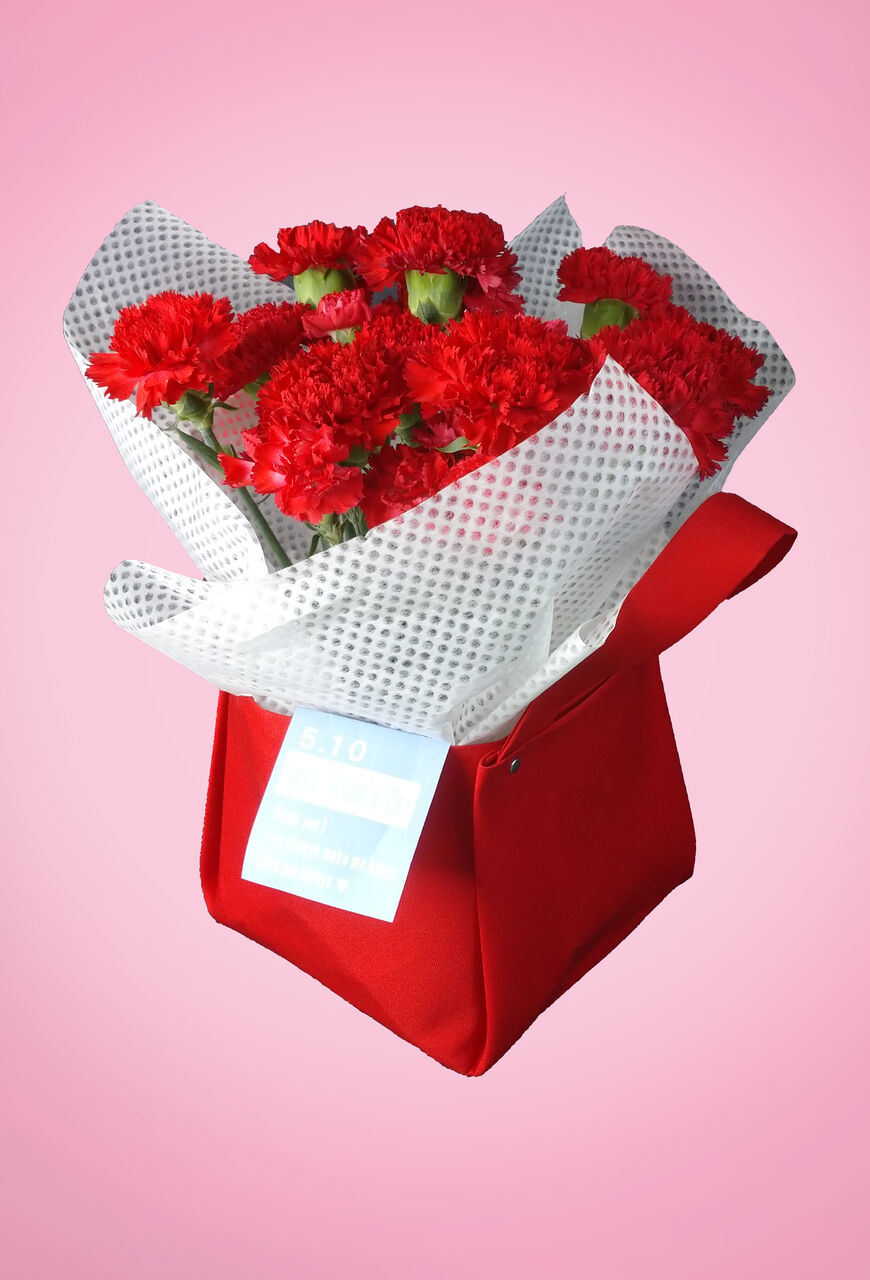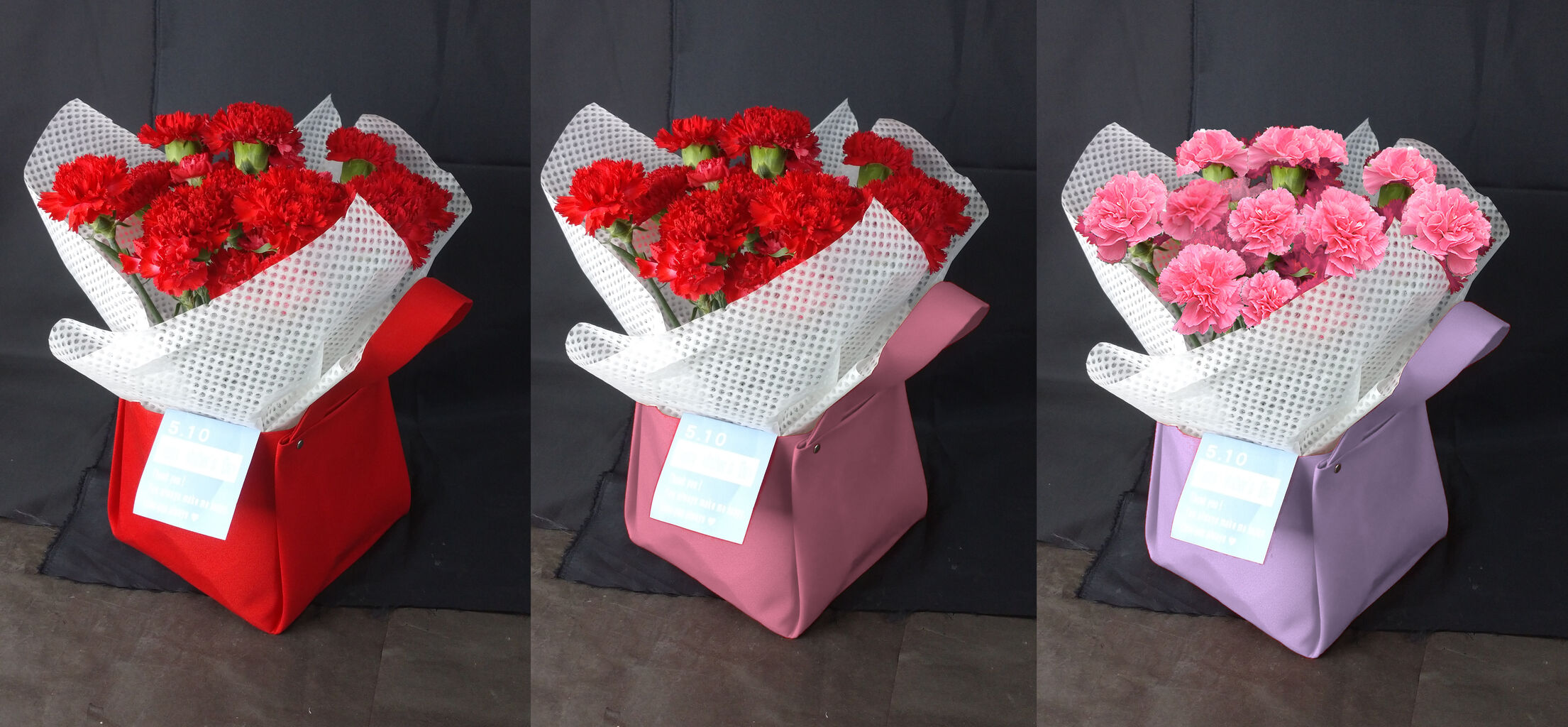 現在、5月10日の母の日に向けて試作品を作っているところですが、この商品の特徴はお花が手付きのバックに入っており、お花を楽しんでもらった後はバックとしてお使い頂けるという点です。