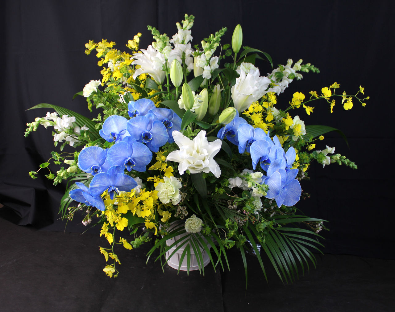 青、黄色の相性はとても良いので、黄色のオンシジウムも挿して仕上げてみました。
